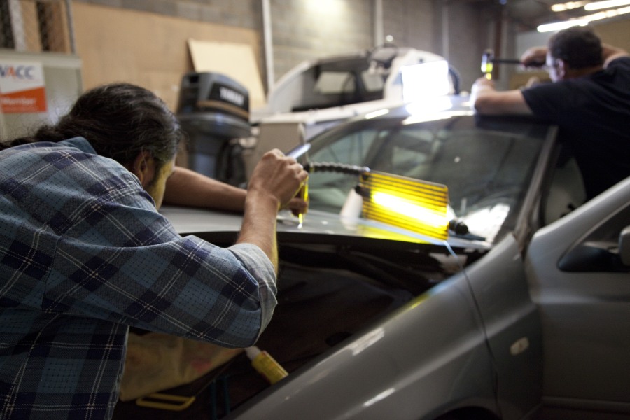 On Day 2, the techs were introduced to quoting techniques and pushing dents as well as tap downs. This of course included the importance of R & R (Remove and Replace). Day 3, and Phill Coutts joins in and offers his expertise on paint technologies, quoting for insurance companies, cutting and buffing and systematically providing some insight into knowing how to approach each job that comes along in the industry. The images below illustrates the various stages of both days as the techs enthusiastically looked on or worked on the dents. They are proceeding with excellence!