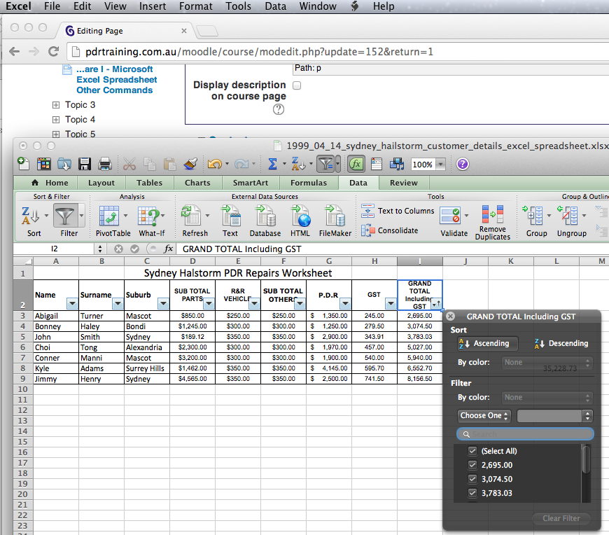 Now this is very powerful as you can now order or filter any column by pressing the arrows next to each column heading – lets try pressing “Grand Total” down arrow. A pop-up menu should come up with options with the heading of the filter you chose – in this case “Grand Total including GST“. These options are the many types of filter conditions you can use!