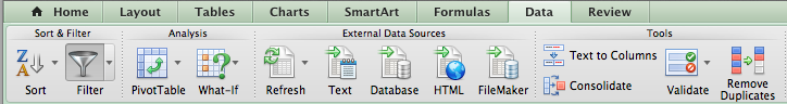 In the data toolbar (once you select Data between Formulas and Review), you will see a Sort button first followed by Filter button. These are described in this section.