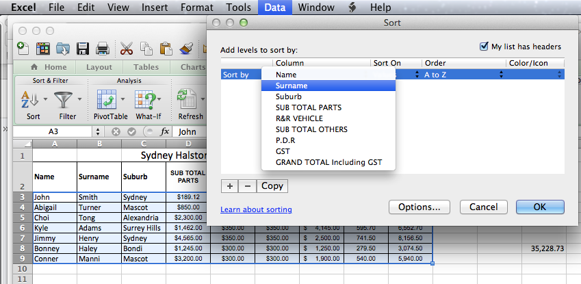 If we wish to sort in alphabetical order by “surname” basically column B, go to data in the menu Data, choose “Surname” to sort by, leave Order as A to Z press ok. Alternatively you can press the Data button on the toolbar and then ![]()